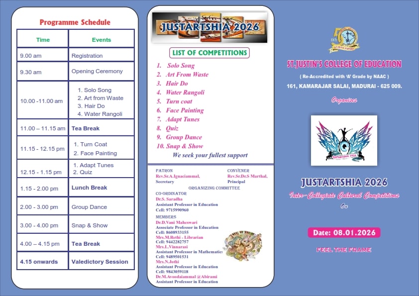 St. Justin’s College of Education, Madurai, on 8th January 2026 at the college premises. The event aims to foster the spirit of cultural development and nation building among students.