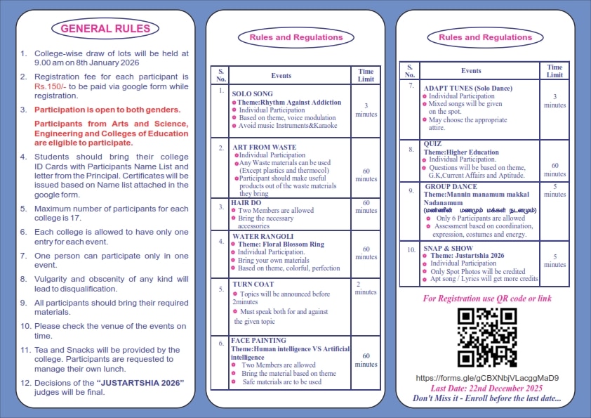 We cordially invite participants from your esteemed institution to join us and experience the vibrant cultural spirit ignited on the Justin campus. Kindly go through the list of events and the schedule mentioned in the attached leaflet for further details. Registration will commence on 6th December 2025 and close on 22nd December 2025 at 4.00 p.m. Registration can be done through the link or QR code provided in the leaflet.